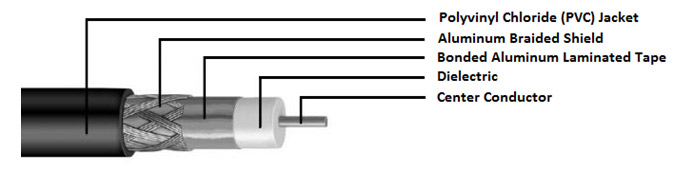 - 20 AWG Copper Cover Steel Center Conductor, Gas Expanded Polyethylene, Bonded Aluminum Laminated Tape, Aluminum Braided Shield and Polyvinyl Chloride Jacket.
