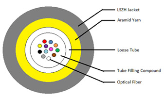 - Optical fibres were positioned in a loose tube made of high modulus plastic that provide reasonable crush resistance and flexibility to the cable. Hydrolysis resistance high strength loose tubes are filled with water-resistance compound filling. The loose tube is cover with a layer of aramid yarn as strength member to ensure tensile strength. The cable is completed with LSZH (Low Smoke, Zero Halogen, Flame-Retardant) jacket. The cable was specially designed with smaller diameter, light weight and provide excellent mechanical and temperature performance.