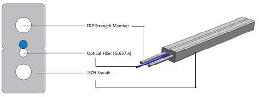 - The G.657.A Class optical fibres are positioned in the center of the cable. Two parallel FRP (Fibre Reinforced Plastic) are placed beside to protect the optical fibres and ensure high tensile strength. The cable is completed with LSZH (Low Smoke, Zero Halogen, and Flame-Retardant) sheath to ensure user safety and environmental friendly. This cable special novel groove design provide simple structure, light weight, metal free and made for easily strip and splice, therefore, simplified installation and maintenance.